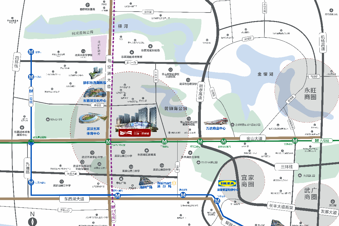 商圈:周边三大商圈环绕,中心广场、海林广场,3站路直达东西湖万达,宜家,自带约32万方商业,涵盖购物中心、风情商业街多重核心配套